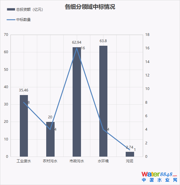 從8月項(xiàng)目中標(biāo)的細(xì)分領(lǐng)域來看,水環(huán)境項(xiàng)目和市政污水項(xiàng)目總投資額都在63億元左右,不相上下,市政污水類項(xiàng)目數(shù)量明顯更多,但水環(huán)境類項(xiàng)目單體投資額更大。聚焦園區(qū)的工業(yè)廢水類大項(xiàng)目逐漸增多,農(nóng)村污水打包類大體量項(xiàng)目也在逐步釋放。