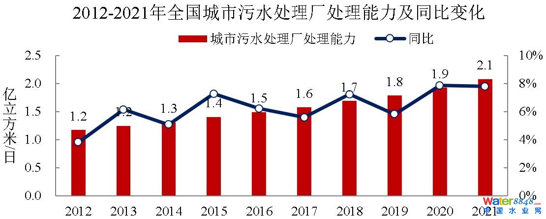 2021年年末,全國(guó)城市排水管道總長(zhǎng)度87.2萬(wàn)公里,同比增長(zhǎng)8.7%;污水處理廠處理能力2.1億立方米/日,同比增長(zhǎng)7.8%。2021年,污水處理率97.89%,比上年增加0.36個(gè)百分點(diǎn);城市生活污水集中收集率68.6%,比上年增加3.8個(gè)百分點(diǎn)。