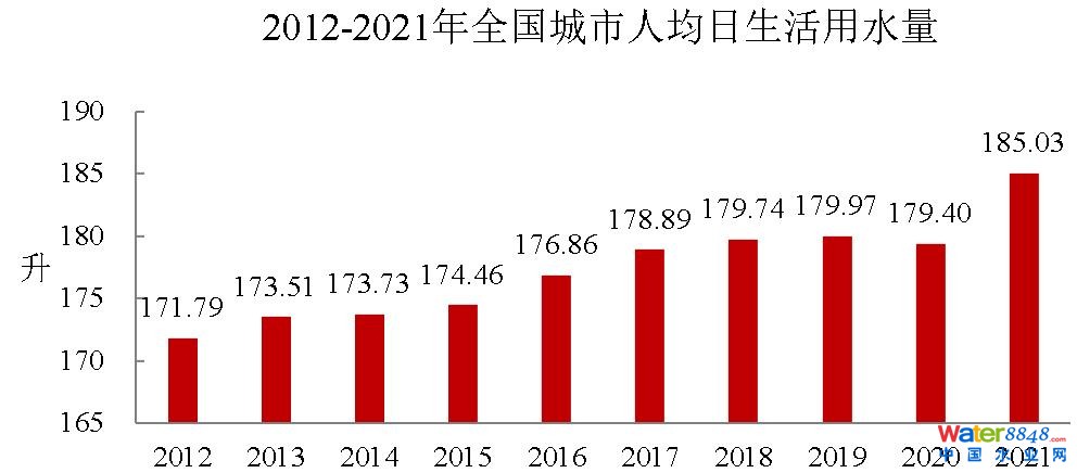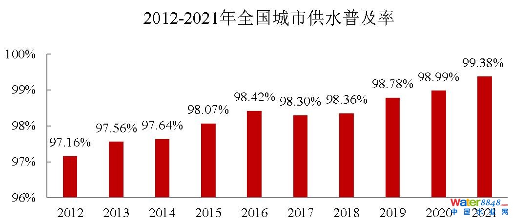 2021年,全國(guó)城市供水總量673.34億立方米,同比增長(zhǎng)6.96%;城市供水管道長(zhǎng)度105.99萬(wàn)公里,同比增長(zhǎng)5.26%;人均日生活用水量185.03升;供水普及率99.38%,比上年增加0.39個(gè)百分點(diǎn)。