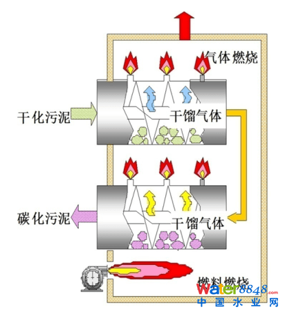污泥碳化基礎(chǔ)工藝是以污泥碳化物為唯一產(chǎn)物,是污泥碳化技術(shù)工程應(yīng)用的主流工藝。碳化過(guò)程中產(chǎn)生的干餾氣被燃燒利用釋放熱量,以減少整個(gè)過(guò)程的能量補(bǔ)充,達(dá)到節(jié)約能源的目的。