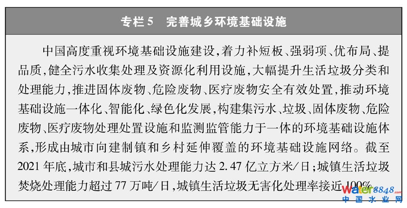 持續(xù)打好污染防治攻堅(jiān)戰(zhàn)。環(huán)境就是民生,青山就是美麗,藍(lán)天也是幸福。中國(guó)堅(jiān)持精準(zhǔn)治污、科學(xué)治污、依法治污,以解決人民群眾反映強(qiáng)烈的大氣、水、土壤污染等突出問題為重點(diǎn),持續(xù)打好藍(lán)天、碧水、凈土保衛(wèi)戰(zhàn)。區(qū)域聯(lián)防聯(lián)控和重污染天氣應(yīng)對(duì)成效顯著,全國(guó)地級(jí)及以上城市細(xì)顆粒物(PM2.5)年均濃度由2015年的46微克/立方米降至2021年的30微克/立方米,空氣質(zhì)量?jī)?yōu)良天數(shù)比例達(dá)到87.5%,成為全球大氣質(zhì)量改善速度最快的國(guó)家。工業(yè)、農(nóng)業(yè)、生活污染源和水生態(tài)系統(tǒng)整治加快推進(jìn),飲用水安全得到有效保障,污染嚴(yán)重水體和不達(dá)標(biāo)水體顯著減少,2021年全國(guó)地表水水質(zhì)優(yōu)良斷面比例達(dá)到84.9%。全面禁止洋垃圾入境,實(shí)現(xiàn)固體廢物“零進(jìn)口”目標(biāo),土壤環(huán)境風(fēng)險(xiǎn)得到基本管控。藍(lán)天白云、繁星閃爍,清水綠岸、魚翔淺底,人們呼吸的空氣更清新、喝的水更干凈、吃的食物更放心、生活的環(huán)境更優(yōu)美,切實(shí)感受到生態(tài)環(huán)境變化帶來的幸福和美好。