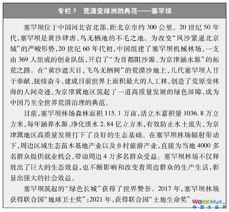 實(shí)施重要生態(tài)系統(tǒng)保護(hù)和修復(fù)重大工程。以國(guó)家重點(diǎn)生態(tài)功能區(qū)、生態(tài)保護(hù)紅線、自然保護(hù)地等為重點(diǎn),啟動(dòng)實(shí)施山水林田湖草沙一體化保護(hù)和修復(fù)工程,統(tǒng)籌推進(jìn)系統(tǒng)治理、綜合治理、源頭治理。陸續(xù)實(shí)施三北、長(zhǎng)江等防護(hù)林和天然林保護(hù)修復(fù)、退耕還林還草、礦山生態(tài)修復(fù)、“藍(lán)色海灣”整治行動(dòng)、海岸帶保護(hù)修復(fù)、渤海綜合治理攻堅(jiān)戰(zhàn)、紅樹林保護(hù)修復(fù)等一批具有重要生態(tài)影響的生態(tài)環(huán)境修復(fù)治理工程,科學(xué)開展大規(guī)模國(guó)土綠化行動(dòng),推動(dòng)森林、草原、濕地、河流、湖泊面積持續(xù)增加,土地荒漠化趨勢(shì)得到有效扭轉(zhuǎn)。2012-2021年,中國(guó)累計(jì)完成造林9.6億畝,防沙治沙2.78億畝,種草改良6億畝,新增和修復(fù)濕地1200多萬(wàn)畝。2021年,中國(guó)森林覆蓋率達(dá)到24.02%,森林蓄積量達(dá)到194.93億立方米,森林覆蓋率和森林蓄積量連續(xù)30多年保持“雙增長(zhǎng)”,是全球森林資源增長(zhǎng)最多和人工造林面積最大的國(guó)家。中國(guó)在世界范圍內(nèi)率先實(shí)現(xiàn)了土地退化“零增長(zhǎng)”,荒漠化土地和沙化土地面積“雙減少”,對(duì)全球?qū)崿F(xiàn)2030年土地退化零增長(zhǎng)目標(biāo)發(fā)揮了積極作用。自2000年以來,中國(guó)始終是全球“增綠”的主力軍,全球新增綠化面積中約1/4來自中國(guó)。
