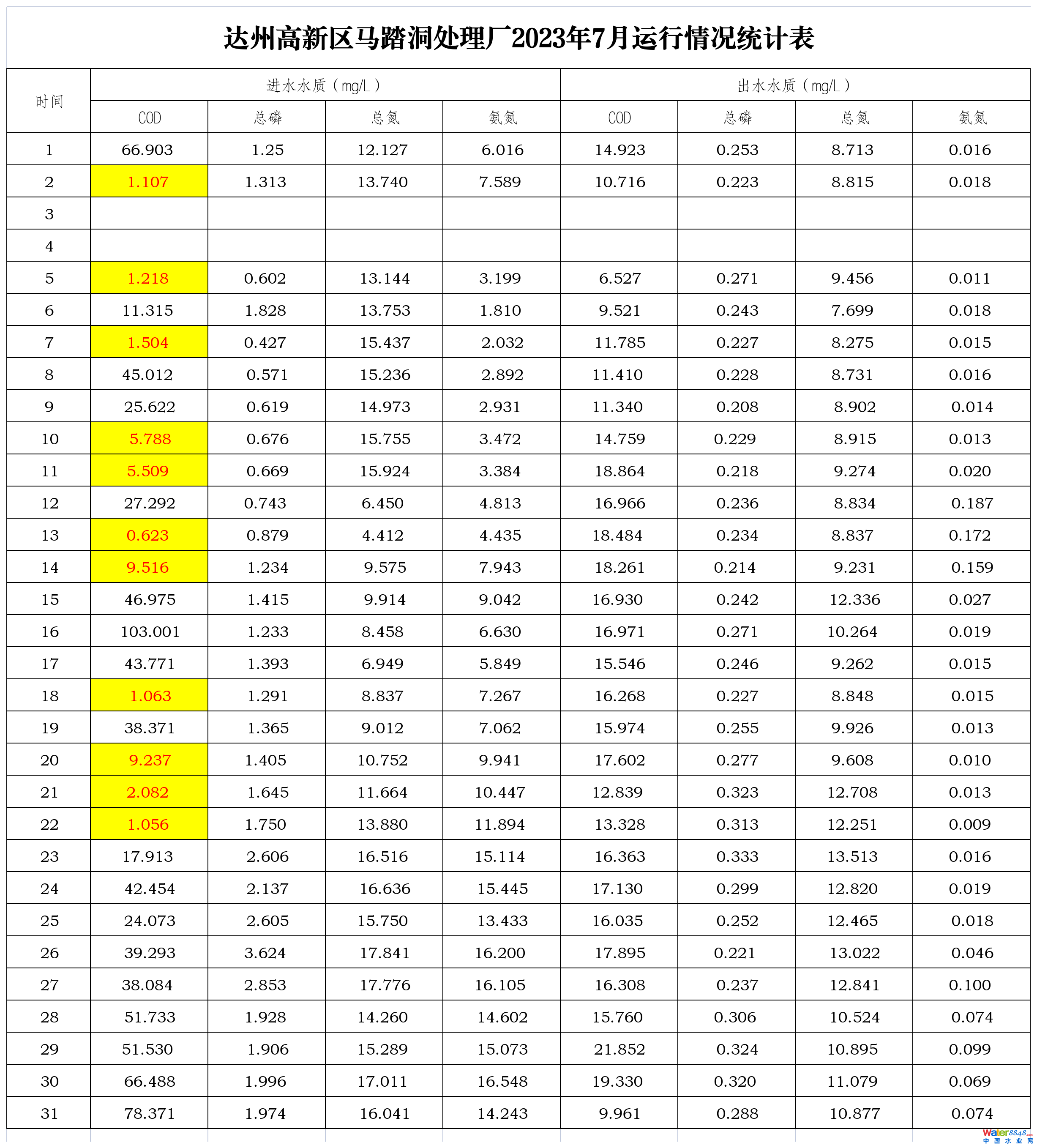 馬踏洞污水處理廠7月份進水濃度多次低于10毫克/升