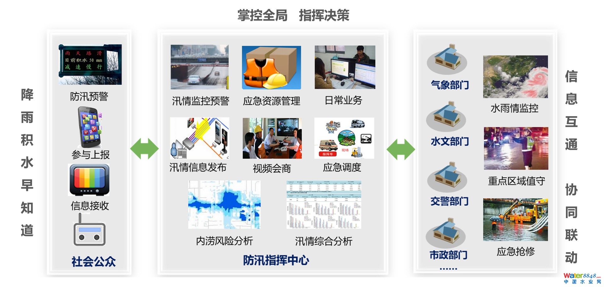 泰華城市防汛預(yù)警與應(yīng)急指揮系統(tǒng)運(yùn)用物聯(lián)網(wǎng)、移動(dòng)互聯(lián)網(wǎng)、地理信息、排水模型技術(shù),匯集整合水情、雨情、工情、防汛物資、人員等方面信息,針對(duì)汛期與非汛期工作要求,提供汛情監(jiān)測(cè)、內(nèi)澇預(yù)警、應(yīng)急指揮與日常業(yè)務(wù)的全面管理,貫穿汛前監(jiān)測(cè)預(yù)警、汛中應(yīng)急調(diào)度、汛后總結(jié)評(píng)估整個(gè)過(guò)程,實(shí)現(xiàn)城市防汛工作的科學(xué)預(yù)報(bào)、統(tǒng)一指揮、精準(zhǔn)決策。
