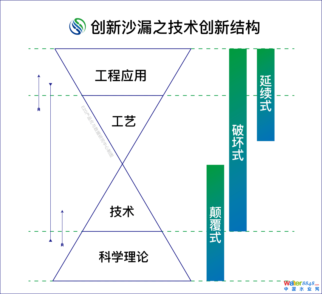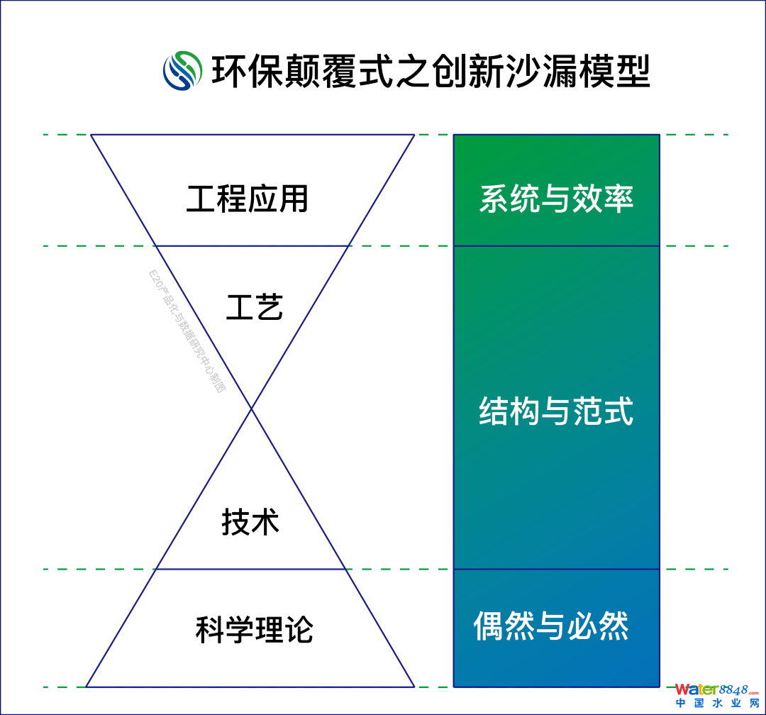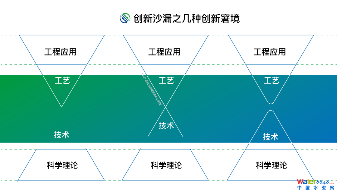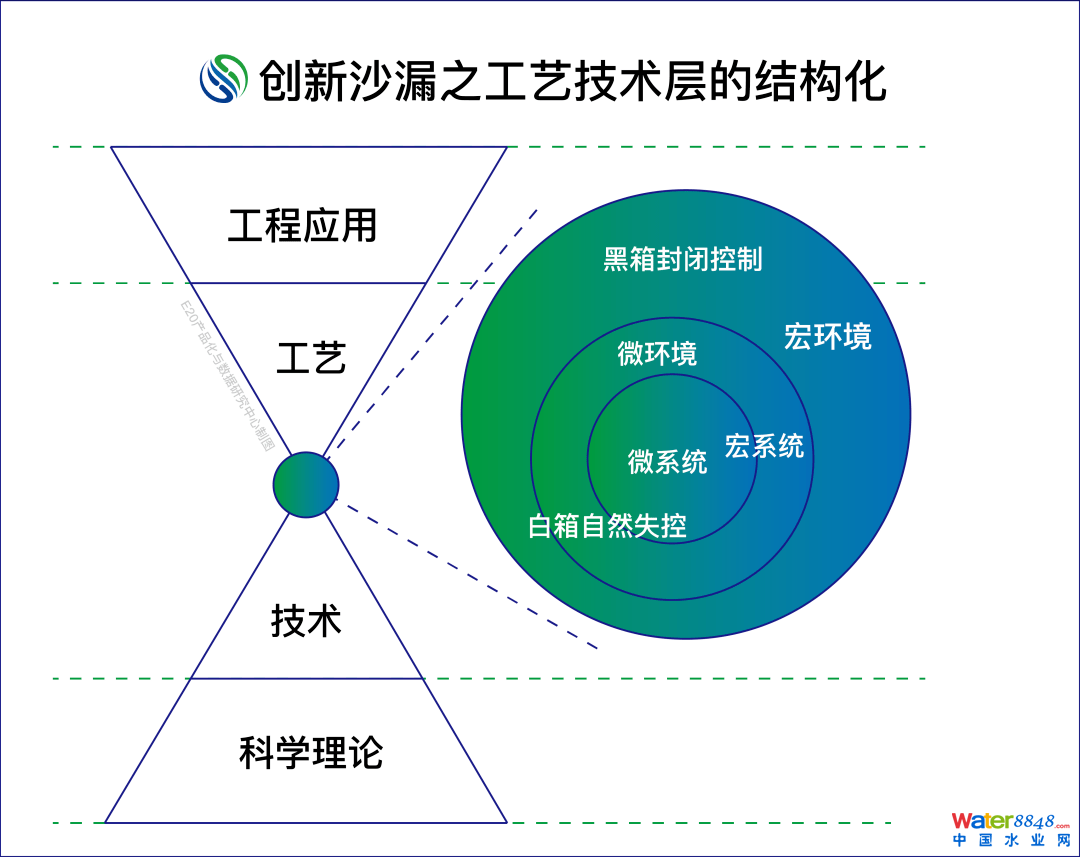 在中國環(huán)保系統(tǒng)內(nèi),“科學理論層”通常由科研院校獨立負責,企業(yè)的領(lǐng)域多在工藝技術(shù)層和工程應(yīng)用層。二者間的配合并不理想,呈現(xiàn)為:一邊研學無用、一邊創(chuàng)新無門。其實質(zhì)一方面是普遍忽視了“工藝技術(shù)”的結(jié)構(gòu)化視野,要么偏上、要么傾下,短了其系統(tǒng)性連接的作用;二則創(chuàng)新系統(tǒng)、創(chuàng)新平臺的稀缺導致三層結(jié)構(gòu)的整合未成顯效,常常失落在“偶然到必然”的途中。