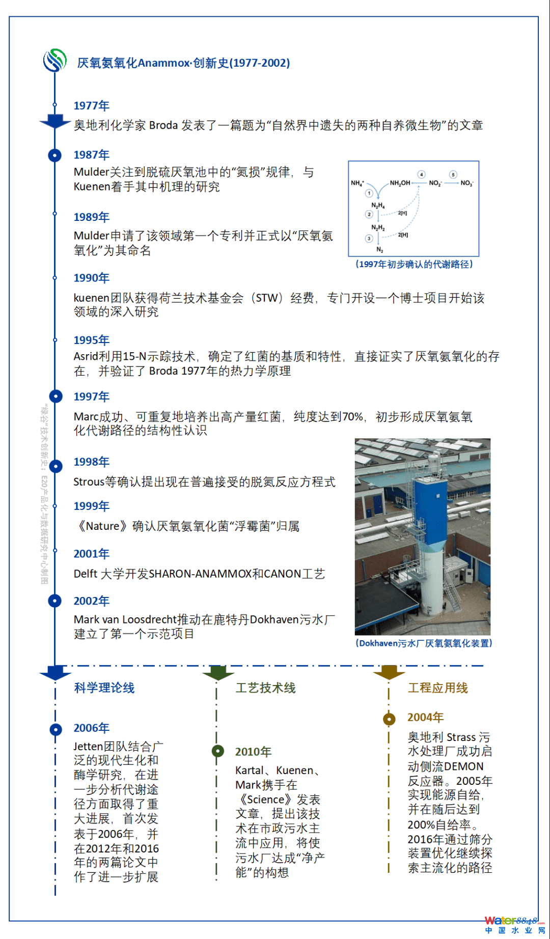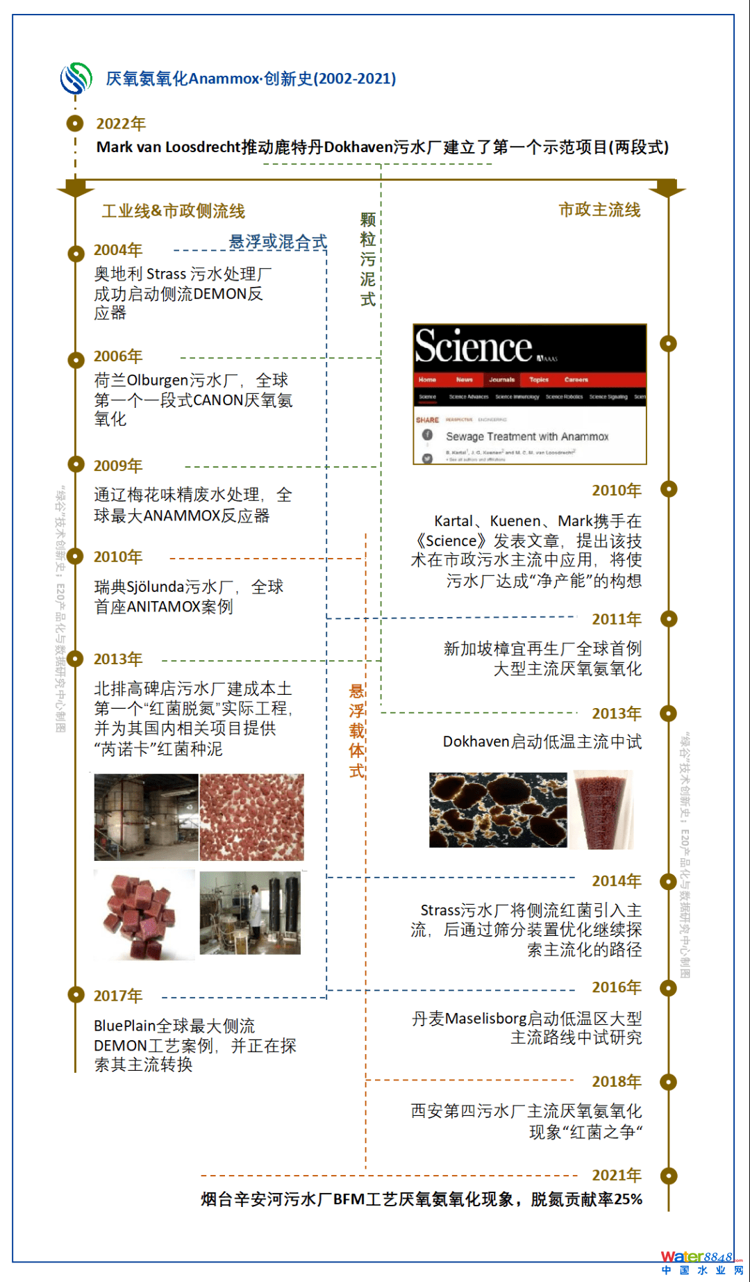1989年,Mulder申請了該領(lǐng)域第一個專利,并正式以“厭氧氨氧化”為其命名;1997年,Kuenen團隊發(fā)布節(jié)點性成果,初步形成其“代謝途徑”的結(jié)構(gòu)性認識;2002年,Mark van Loosdrecht推動在鹿特丹Dokhaven污水廠建立了第一個示范工程;2010年,Kartal、Kuenen、Mark攜手在《Science》發(fā)表文章,提出該技術(shù)在市政污水主流中應(yīng)用將使污水廠達成“凈產(chǎn)能”的構(gòu)想。