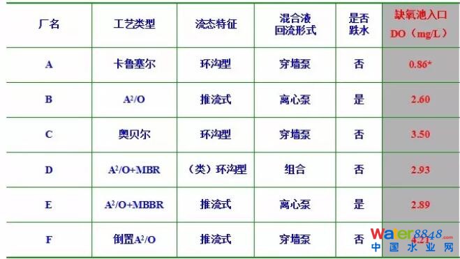 經(jīng)調(diào)查,目前許多污水處理廠耗氧池后的末端溶解氧含量都在2mg/L以上,有些甚至達(dá)到6-7mg/L,這部分溶解氧不能得到有效控制,缺氧池將會(huì)無(wú)法達(dá)到真正缺氧的狀態(tài)。研究利用模擬公式對(duì)幾個(gè)污水處理廠進(jìn)行模擬實(shí)驗(yàn),得到不同工藝和條件下末端溶解氧的含量,結(jié)果如下: