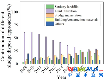 目前,污泥處置的主要技術(shù)路線有衛(wèi)生填埋、焚燒、建材生產(chǎn)、土地利用等,在2019年,我國市政污泥中約29.3%通過土地利用進(jìn)行處置,其次是焚燒(26.7%)和衛(wèi)生填埋(20.1%),而建筑材料利用(15.9%)和其他方式(8.0%)貢獻(xiàn)較小。圖2顯示,土地利用是我國污泥處置的主要技術(shù)路線,但是其比例從2009年的60.9%逐年下降到2019年的29.3%。與此同時,焚燒處置從2009年的6.2%上升到2019年的26.7%;而2009年時,衛(wèi)生填埋僅占污泥處置總量的3.71%,2019年這一數(shù)字上升到了20.1%。從這些結(jié)果我們可以清楚看出,近些年來中國污泥的處置策略發(fā)生了較大的變化,逐漸從無序堆放向土地利用、焚燒逐漸轉(zhuǎn)變,并趨于多元化,這表明中國政府在污泥的安全和標(biāo)準(zhǔn)化處置方面取得了巨大的進(jìn)步。 圖3 不同污泥處置技術(shù)在2009年—2019年間的變化情況