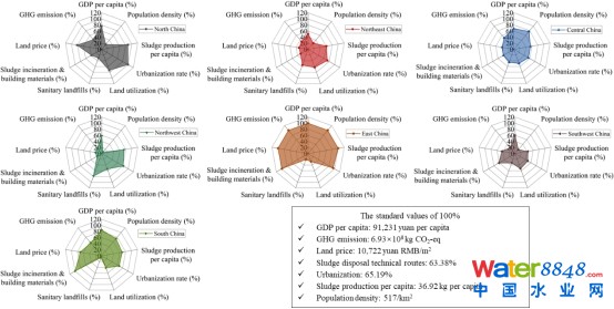 當(dāng)前,我國7個行政區(qū)污泥處理技術(shù)路線差異顯著,且不同技術(shù)分布極不均衡,主要特征及影響因素可總結(jié)如下: (1)地區(qū)經(jīng)濟(jì)水平、城鎮(zhèn)化率、當(dāng)?shù)卣咧С至Χ纫约巴恋貎r(jià)格會影響污泥處理處置技術(shù)路線的選擇。例如焚燒和干燥技術(shù)雖然投資大且能耗高,但其工程占地面積小,在我國東部和華北地區(qū)的應(yīng)用較為廣泛;而東北和華中地區(qū)則以好氧堆肥技術(shù)作為主要的污泥處理工藝。 (2)我國污泥設(shè)備的處理能力在2009年—2019年顯著提高,具體地,污泥堆肥處理能力在2011年—2015年間大幅提升,厭氧消化則在2014年—2019年期間,焚燒處理為2017年—2019年期間,相對應(yīng)的污泥深度脫水和熱水解在2013年—2016年間飛速發(fā)展。 (3)污泥焚燒是我國城鎮(zhèn)污泥處置過程中GHG排放的最主要貢獻(xiàn)者,占到全國污泥處置GHG總排放量的45.1%,該現(xiàn)象在華東地區(qū)尤甚。 (4)我國污泥經(jīng)厭氧消化/好氧堆肥處理后,進(jìn)行土地利用的比例約為26.5%,這一數(shù)據(jù)仍低于歐盟的50.0%。 (5)華東、華北地區(qū)不同工藝路線及其預(yù)處理之間建立了緊密的聯(lián)系,如熱水解與厭氧消化技術(shù),污泥干化與污泥焚燒技術(shù)。 圖7 2019年中國不同污泥處置技術(shù)路線選擇情況與區(qū)域人口密度、土地資源分布特征關(guān)系圖