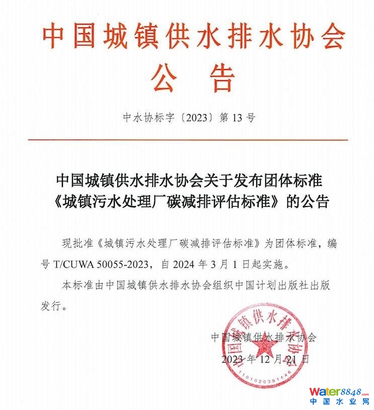 中國(guó)城鎮(zhèn)供水排水協(xié)會(huì)發(fā)布 《城鎮(zhèn)污水處理廠碳減排評(píng)估標(biāo)準(zhǔn)》團(tuán)體標(biāo)準(zhǔn),自2024年3月1日起實(shí)施 來(lái)源:中國(guó)城鎮(zhèn)供水排水協(xié)會(huì) 導(dǎo)讀:團(tuán)體標(biāo)準(zhǔn)《城鎮(zhèn)污水處理廠碳減排評(píng)估標(biāo)準(zhǔn)》于近日發(fā)布。 近日,