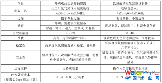 目前主流的次氯酸鈉投加系統(tǒng)主要分為“外購(gòu)成品次氯酸鈉溶液投加” 與“次氯酸鈉發(fā)生器現(xiàn)場(chǎng)制備投加”兩種,這兩種投加系統(tǒng)的對(duì)比如下所示。