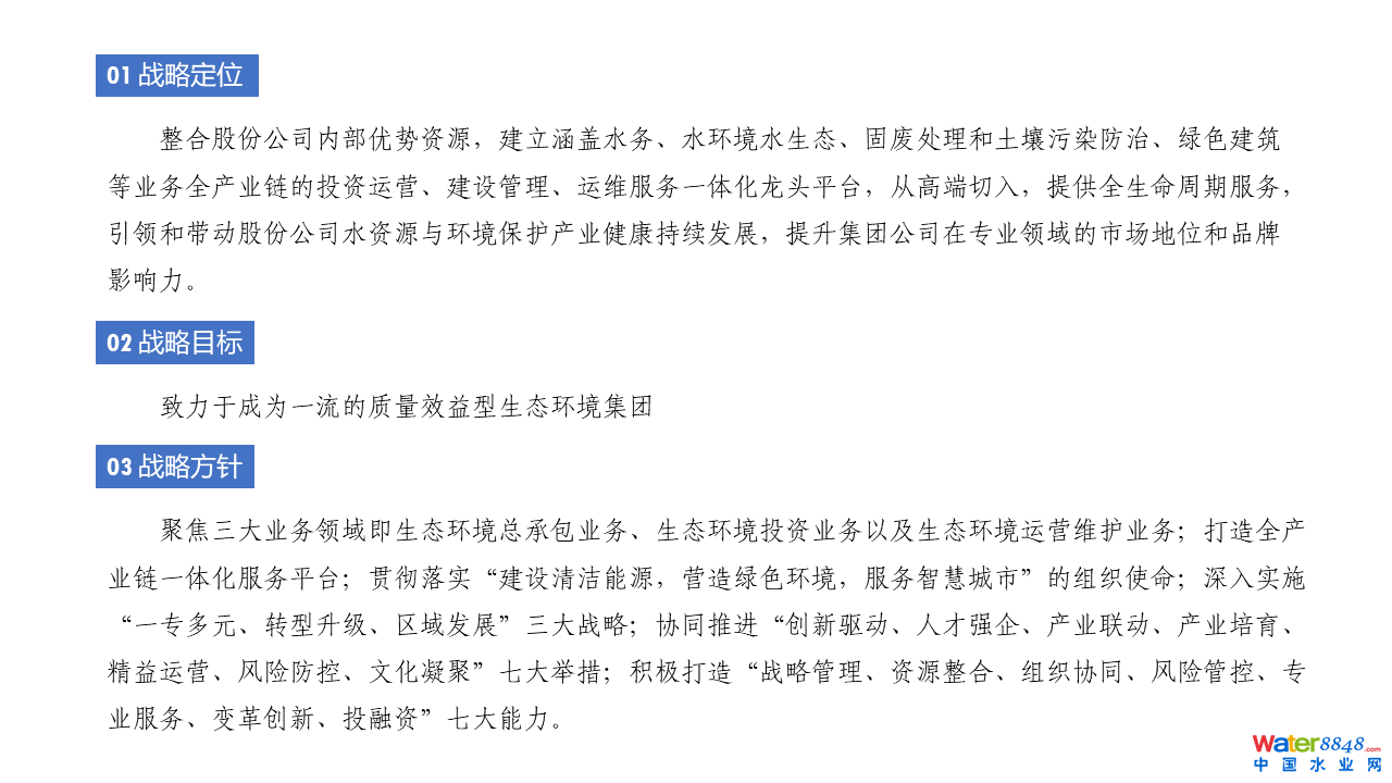 百舸爭流,奮楫者先。中電建生態(tài)環(huán)境集團將堅持以習近平新時代中國特色社會主義思想和習近平生態(tài)文明思想為指引,不忘初心、牢記使命,依托中國電建資源優(yōu)勢和全產(chǎn)業(yè)鏈一體化優(yōu)勢,以“建設一流的質量效益型生態(tài)環(huán)境集團”為愿景,堅持“業(yè)務經(jīng)營”“資本運作”雙輪驅動,“強總部、精專業(yè)、細項目”,建設清潔能源、營造綠色環(huán)境、服務智慧城市,為國家生態(tài)文明建設和經(jīng)濟社會發(fā)展作出新的更大貢獻。