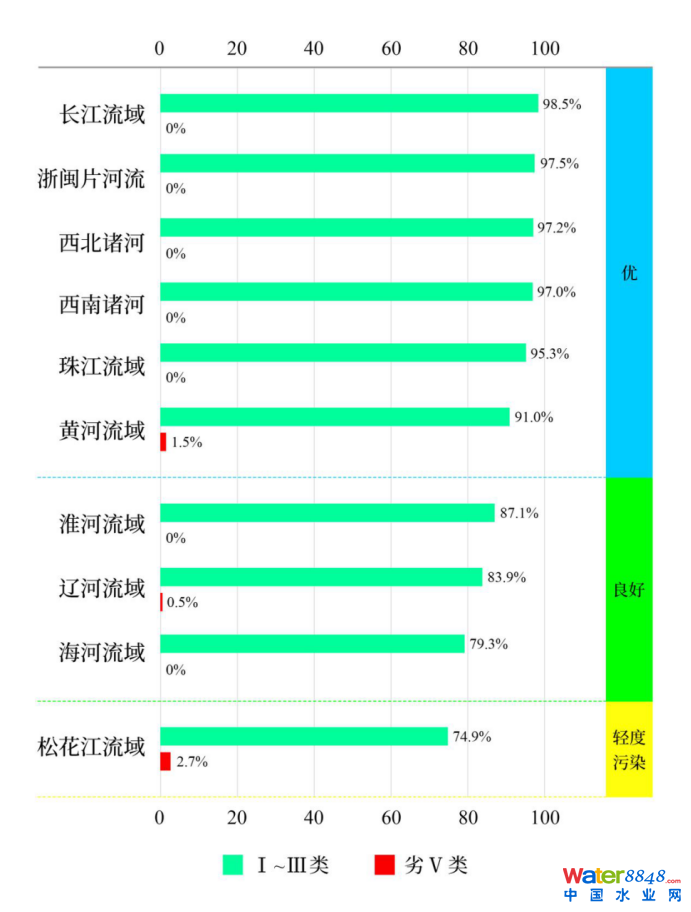 圖2 1—12月七大流域和西南、西北諸河及浙閩片河流水質(zhì)類別比例