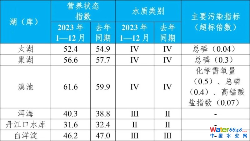 1—12月,監(jiān)測(cè)的209個(gè)重點(diǎn)湖(庫)中,水質(zhì)優(yōu)良(Ⅰ—Ⅲ類)湖庫個(gè)數(shù)占比74.6%,同比上升0.8個(gè)百分點(diǎn);劣Ⅴ類水質(zhì)湖庫個(gè)數(shù)占比4.8%,同比持平。主要污染指標(biāo)為總磷、化學(xué)需氧量和高錳酸鹽指數(shù)。205個(gè)監(jiān)測(cè)營(yíng)養(yǎng)狀態(tài)的湖(庫)中,中度富營(yíng)養(yǎng)的8個(gè),占3.9%;輕度富營(yíng)養(yǎng)的48個(gè),占23.4%;其余湖(庫)為中營(yíng)養(yǎng)或貧營(yíng)養(yǎng)狀態(tài)。其中,太湖和巢湖均為輕度污染、輕度富營(yíng)養(yǎng),主要污染指標(biāo)為總磷;滇池為輕度污染、中度富營(yíng)養(yǎng),主要污染指標(biāo)為化學(xué)需氧量、總磷和高錳酸鹽指數(shù);洱海和白洋淀均水質(zhì)良好、中營(yíng)養(yǎng);丹江口水庫水質(zhì)為優(yōu)、中營(yíng)養(yǎng)。