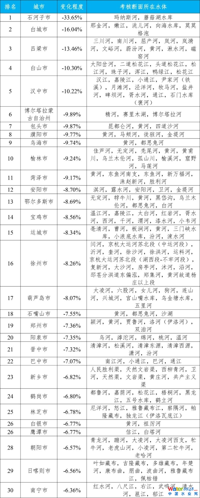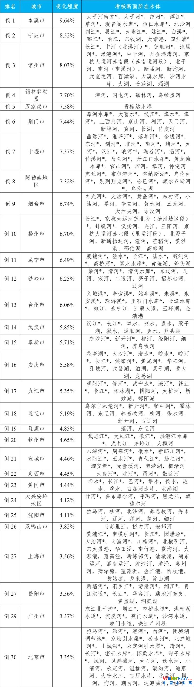 石河子市、白城市和呂梁市等30個(gè)城市國(guó)家地表水考核斷面水環(huán)境質(zhì)量變化情況相對(duì)較好(從第1名至第30名),本溪市、寧波市和常州市等30個(gè)城市國(guó)家地表水考核斷面水環(huán)境質(zhì)量變化情況相對(duì)較差(從倒數(shù)第1名至倒數(shù)第30名)。見附表3—4。