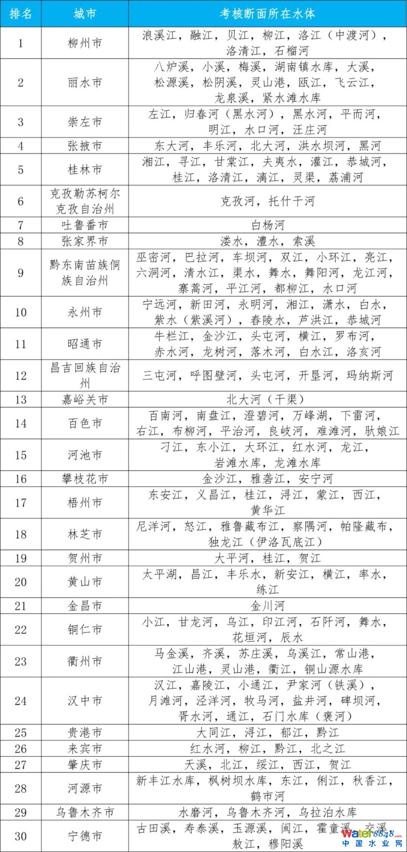 1—12月,全國(guó)地級(jí)及以上城市中,柳州市、麗水市和崇左市等30個(gè)城市國(guó)家地表水考核斷面水環(huán)境質(zhì)量相對(duì)較好(從第1名至第30名),五家渠市、商丘市和開封市等30個(gè)城市國(guó)家地表水考核斷面水環(huán)境質(zhì)量相對(duì)較差(從倒數(shù)第1名至倒數(shù)第30名),見附表1—2。