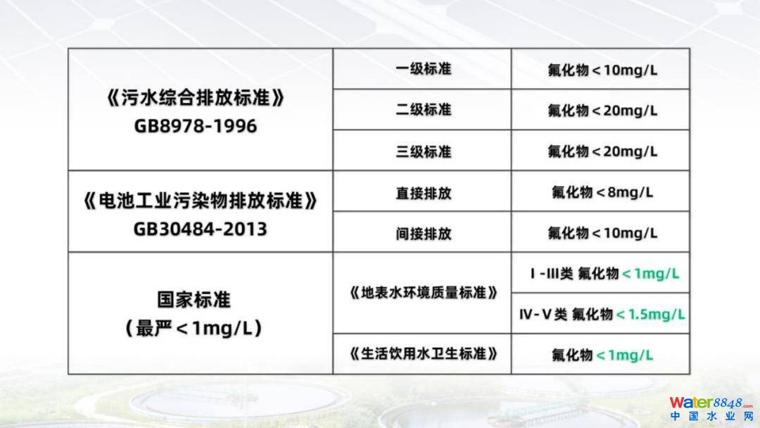 近年來,從國(guó)家到各地方也相繼出臺(tái)了一系列工業(yè)廢水重點(diǎn)污染物排放總量控制指標(biāo)政策,水體氟化物治理標(biāo)準(zhǔn)和要求不斷提升,有些區(qū)域甚至以《地表水環(huán)境質(zhì)量標(biāo)準(zhǔn)》三類限值作為排放標(biāo)準(zhǔn)來執(zhí)行;《江蘇城鎮(zhèn)污水處理污染物排放標(biāo)準(zhǔn)》更是要求自2023年3月28日起,氟化物排放限值降至1.5 mg/L,環(huán)保形勢(shì)日益嚴(yán)峻。