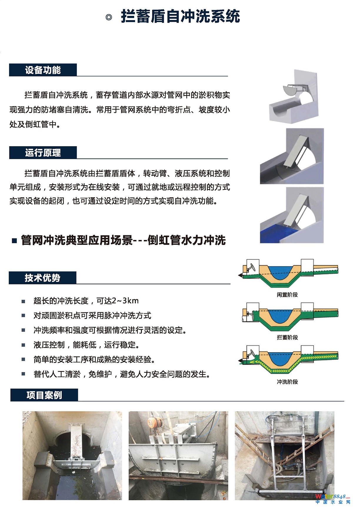攔蓄盾自沖洗系統(tǒng),蓄存管道內(nèi)部水源對(duì)管網(wǎng)中的淤積物實(shí)現(xiàn)強(qiáng)力的防堵塞自清洗。常用于管網(wǎng)系統(tǒng)中的彎折點(diǎn)、坡度較小處及倒虹管中。攔蓄盾自沖洗系統(tǒng)由攔蓄盾盾體,轉(zhuǎn)動(dòng)臂、液壓系統(tǒng)和控制單元組成,安裝形式為在線安裝,可通過(guò)就地或遠(yuǎn)程控制的方式實(shí)現(xiàn)設(shè)備的起閉,也可通過(guò)設(shè)定時(shí)間的方式實(shí)現(xiàn)自沖洗功能。