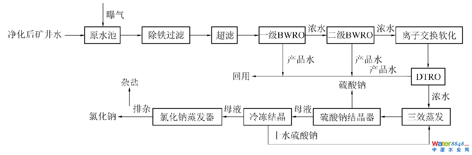某礦應(yīng)地方環(huán)保部門要求,礦井水要實(shí)現(xiàn)零排放,處理后的產(chǎn)品水滿足飲用水要求。原水中TDS含量為2 505 mg/L,總體處理規(guī)模為600 m3/h,一期300 m3/h,預(yù)處理段工藝采用過(guò)濾除鐵、超濾及離子交換軟化工藝,濃縮段工藝采用BWRO+SWRO+DTRO工藝,蒸發(fā)結(jié)晶分鹽段采用三效蒸發(fā)工藝,工藝流程見圖1。最終產(chǎn)品水滿足《生活飲用水衛(wèi)生標(biāo)準(zhǔn)》(GB 5749—2006),TDS≤300mg/L,硫酸鈉符合GB/T 6009—2014工業(yè)硫酸鈉Ⅲ類合格品,氯化鈉符合GB/T 5462—2016日曬工業(yè)鹽二級(jí)指標(biāo),項(xiàng)目總投資1.35億元,日噸水投資1.02萬(wàn)元,水處理直接運(yùn)行成本5.12元/噸水,綜合運(yùn)行成本7.89元/噸水,系統(tǒng)綜合水回收率96.5%。