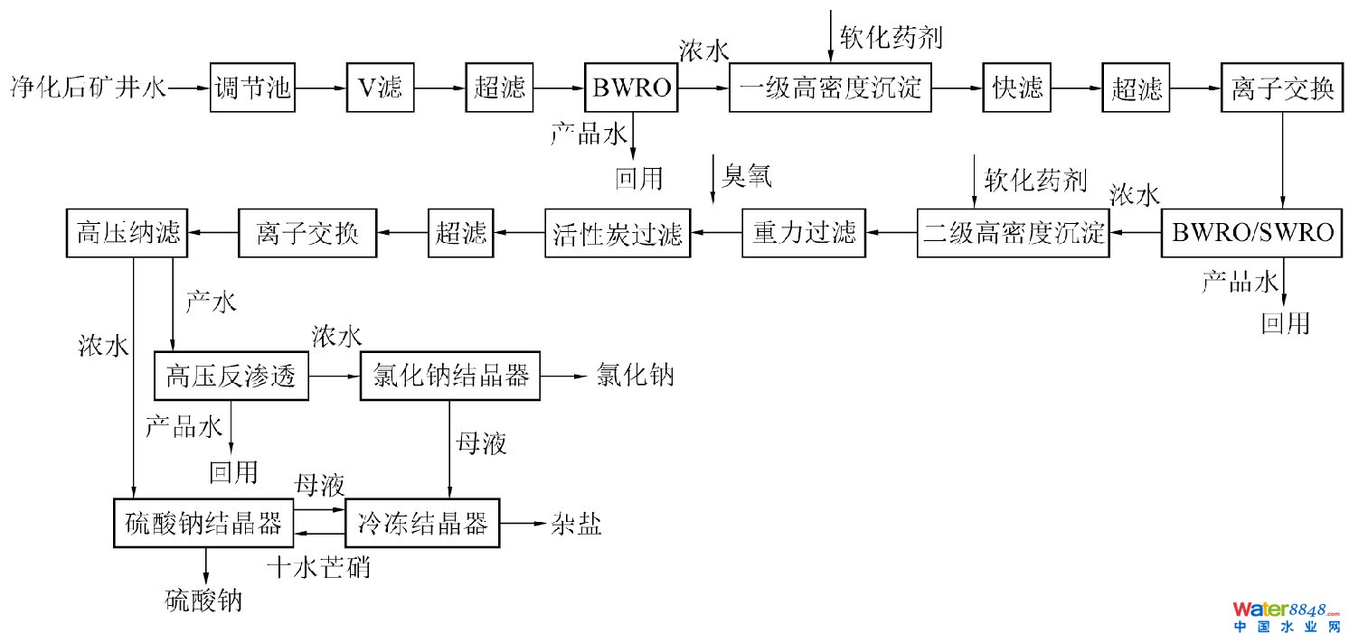 某地區(qū)外排礦井水要求滿足《地表水環(huán)境質(zhì)量標(biāo)準(zhǔn)》表1Ⅲ類和表2指標(biāo)要求,外排水含鹽量3 000 mg/L,其中SO42-860 mg/L、Cl-380 mg/L,設(shè)計(jì)規(guī)模30 000 m3/d。預(yù)處理段采用三級(jí)超濾、兩級(jí)高密藥劑軟化、兩級(jí)離子交換及臭氧分步協(xié)同預(yù)處理工藝,膜濃縮段采用BWRO+BWRO/SWRO+HPNF/HPRO工藝,蒸發(fā)結(jié)晶段采用膜法分鹽結(jié)晶工藝,工藝流程見圖3。最終產(chǎn)品水滿足《地表水環(huán)境質(zhì)量標(biāo)準(zhǔn)》Ⅲ類,TDS≤1 000 mg/L,SO42-≤250 mg/L,Cl-≤250 mg/L,硫酸鈉符合GB/T6009—2014工業(yè)硫酸鈉Ⅱ類一等品,氯化鈉符合GB/T 5462—2016精制工業(yè)鹽二級(jí)指標(biāo),項(xiàng)目投資3.8億,日噸水投資1.26萬(wàn)元,水處理直接運(yùn)行成本8.2元/噸水,綜合運(yùn)行成本10.3元/噸水,系統(tǒng)綜合水回收率97%。