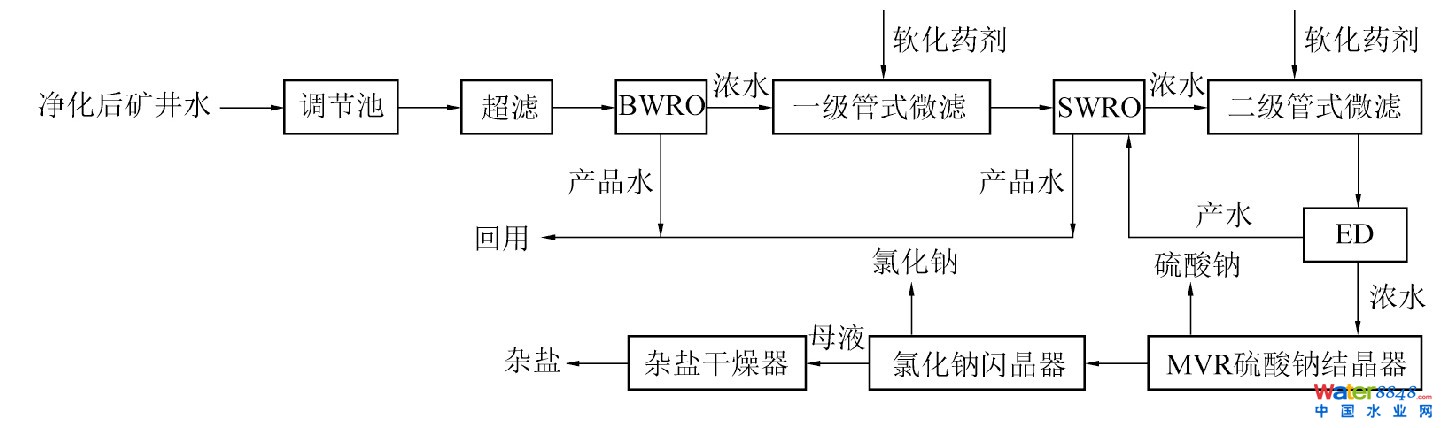某礦應(yīng)地方環(huán)保部門要求,外排水含鹽量不超過(guò)1 600 mg/L,硫酸鹽不超過(guò)650 mg/L,實(shí)際水中含鹽量4 500 mg/L,硫酸鹽2 500 mg/L,設(shè)計(jì)規(guī)模590 m3/h。預(yù)處理段采用超濾、兩級(jí)藥劑軟化及管式微濾分步協(xié)同預(yù)處理工藝,膜濃縮段采用BWRO+SWRO+ED工藝,蒸發(fā)結(jié)晶段采用MVR熱法結(jié)晶分鹽工藝,工藝流程見圖2。最終產(chǎn)品水滿足中水再生利用標(biāo)準(zhǔn),TDS≤1 000 mg/L,SO42-≤250 mg/L,Cl-≤250 mg/L,硫酸鈉符合GB/T6009—2014工業(yè)硫酸鈉Ⅱ類一等品,氯化鈉符合GB/T 5462—2016精制工業(yè)鹽二級(jí)指標(biāo),項(xiàng)目投資1.4億,日噸水投資1.08萬(wàn)元,水處理直接運(yùn)行成本6.4元/噸水,綜合運(yùn)行成本8.14元/噸水,系統(tǒng)綜合水回收率97%。