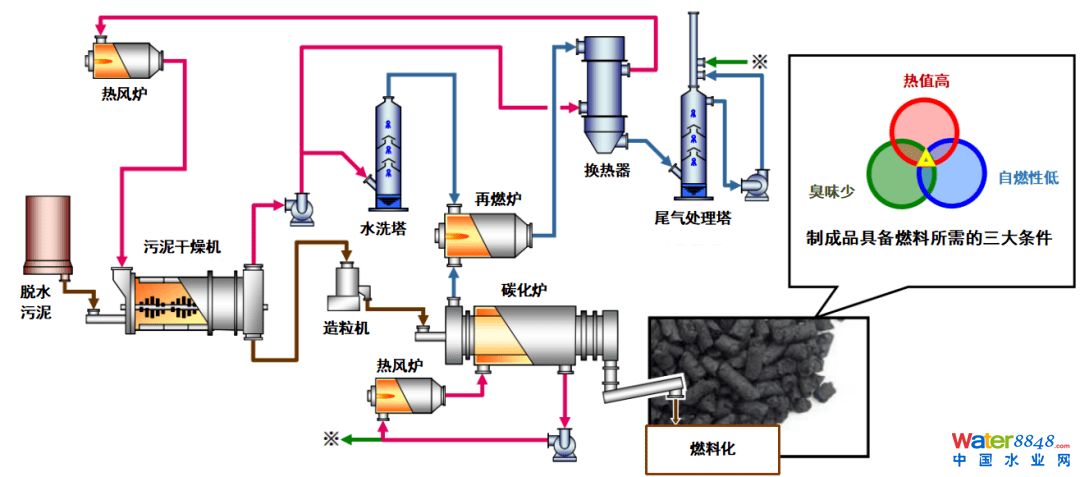 日本在污泥碳化資源化利用方面,關(guān)注的重點不是熱解氣而是碳化處理得到的污泥碳化物。其目標(biāo)是推進污泥碳化物在燃料、土地利用、建材利用等各方面得到應(yīng)用。