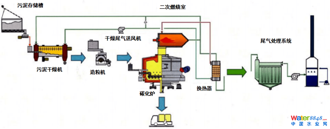 基礎(chǔ)工藝通常由污泥干化、污泥碳化、尾氣處理等主要單元組成,如圖5所示。