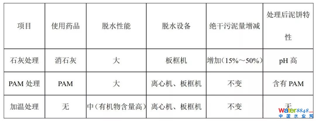 ④減少污泥濃縮脫水藥劑投加量,濃縮污泥、脫水污泥須采用濃縮前處理(高分子凝聚劑、熱處理等)、脫水前處理(石灰處理、凝聚處理、污泥加溫處理或膜濃縮處理)方式提高處理效果,脫水預(yù)處理效果見表1,添加石灰雖然可使污泥脫水性提高,但會(huì)增加絕干污泥量15%~50%,且污泥堿度高,不利于污泥后續(xù)處置,一般較少采用。
