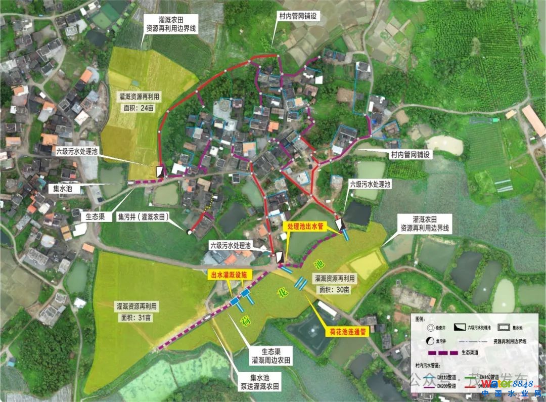 電白區(qū)沙瑯鎮(zhèn)會(huì)業(yè)村采用了五級(jí)凈化池來收集和處理污水,經(jīng)過濾沉淀和厭氧發(fā)酵后達(dá)到了農(nóng)田灌溉用水標(biāo)準(zhǔn),用于農(nóng)田灌溉;