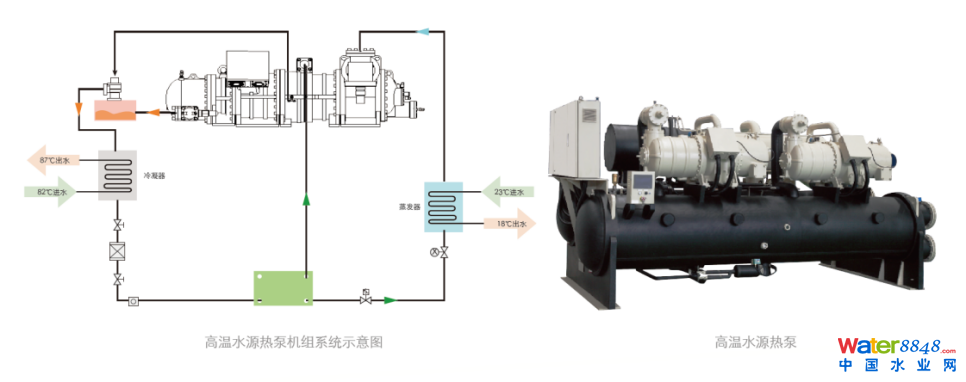 本項(xiàng)目選用高溫水源熱泵提取污水廠中水能量作為污泥干化熱源,冷凝側(cè)出水溫度可達(dá)到87℃,滿足真空干化階段水汽蒸發(fā)所需加熱溫度。高溫水源熱泵技術(shù)既合理利用現(xiàn)有資源,又降低了污泥干化能耗和運(yùn)行成本。系統(tǒng)通過回收冷卻回水熱量,增大水源熱泵熱源的穩(wěn)定性和COP 值。系統(tǒng)可根據(jù)進(jìn)水溫度調(diào)節(jié)壓縮機(jī)運(yùn)行臺(tái)數(shù),節(jié)約電能消耗。源水回水指標(biāo)無(wú)變化,直接回廠區(qū)消毒池前端,系統(tǒng)不額外產(chǎn)生污水。