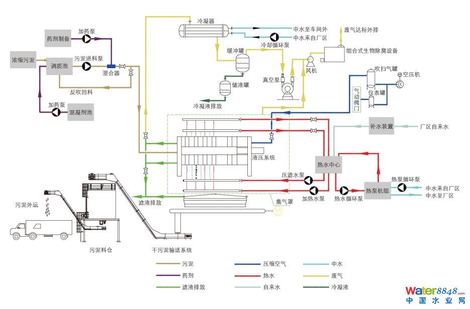 (DZG-2000/800型,4用1備,單套技術(shù)裝備的污泥處理能力為56.25t/d),主要包含污泥調(diào)質(zhì)系統(tǒng)、低溫真空脫水干化主機(jī)系統(tǒng)、污泥進(jìn)料系統(tǒng)、熱水系統(tǒng)、真空冷卻系統(tǒng)、空氣壓縮系統(tǒng)、物料輸送系統(tǒng)、除臭系統(tǒng)、清洗系統(tǒng)、自控系統(tǒng)等。