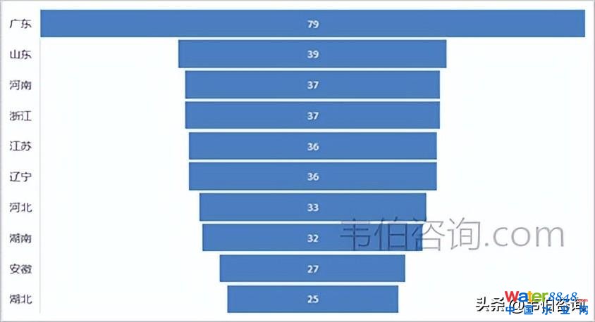 從擁有設(shè)計(jì)處理能力為10萬(wàn)噸/日的污水處理廠數(shù)量來(lái)看:廣東省以79座的規(guī)模位遙遙領(lǐng)先;位列第二的山東省僅為廣東省的一半,河南省和浙江省以37座的數(shù)量位列第三,江蘇省和遼寧省以36座的數(shù)量位列第五位。