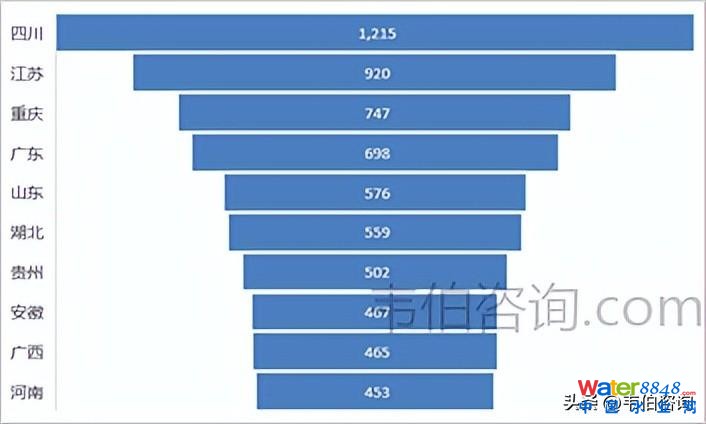 從污水處理廠絕對(duì)數(shù)量來(lái)看:四川省位列全國(guó)第一,達(dá)1215座;江蘇和重慶緊隨其后,廣東和山東排名第四、五位。