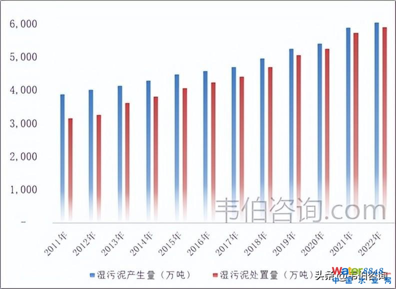 2022年,全國(guó)城市及縣城污水廠產(chǎn)生的污泥量已突破6,000萬(wàn)噸(以含水率80%計(jì)),繼續(xù)保持逐年增長(zhǎng)的趨勢(shì)。