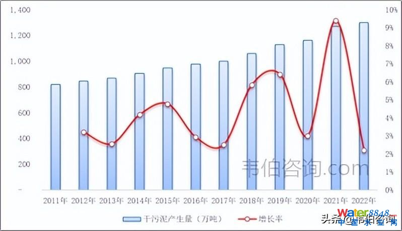 圖表6:2011-2022年全國(guó)城市干污泥產(chǎn)生量及增長(zhǎng)率(萬(wàn)噸,%)