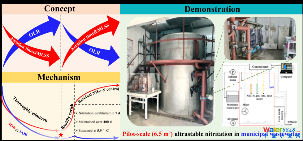 基于“新起點(diǎn)”概念的亞硝化策略與機(jī)理,以及坐落于北京工業(yè)大學(xué)校內(nèi)的中試現(xiàn)場圖