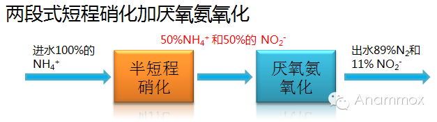③技術(shù)流程:那么厭氧氨氧化菌富集成功后,怎么應用呢?我們都知道,厭氧氨氧化反應需要同時存在氨氮和亞硝酸鹽氮,且氨氮與亞硝氮的比例接近1:1.32。而半短程硝化反應恰好可以將進水的一半氨氮通過 AOB 傳化成亞硝酸鹽,正好滿足厭氧氨氧化反應的進水要求。而半短程硝化反應器也可以采用 SHARON, SBR 等多種形式。