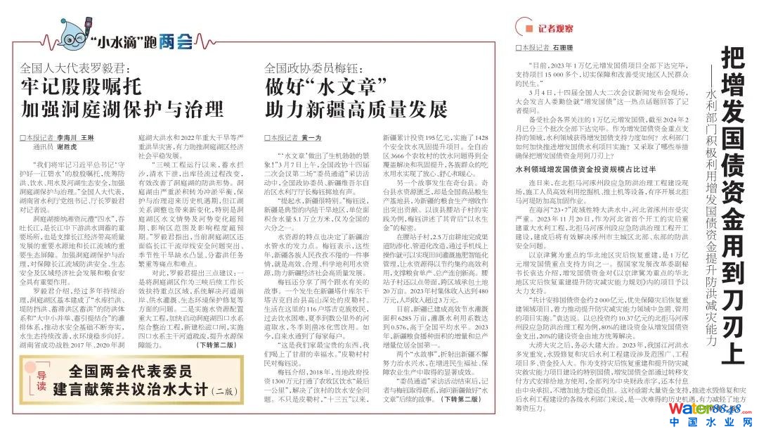 今年全國兩會期間,中國水利報就加強洞庭湖保護與治理的相關建議專訪全國人大代表,湖南省水利廳黨組書記、廳長羅毅君,于3月8日在報紙頭版《“小水滴”跑兩會》專題刊發(fā)此文。