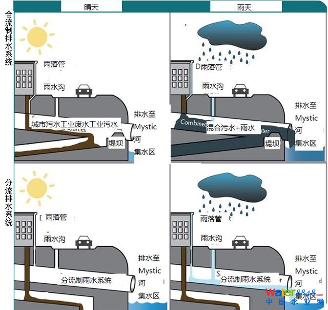 不同的排水系統(tǒng)(雨污)系統(tǒng)具有不同的結(jié)構(gòu),雖然現(xiàn)代排水系統(tǒng)已經(jīng)在一些地方用獨(dú)立的管道分離了雨水、生活污水和工業(yè)廢水,但像美國(guó)波士頓的一些舊排水系統(tǒng)仍然是合流制,排水管同時(shí)收集雨水及污水。在晴天的條件下,排水管里的污水全部被輸送至污水處理廠;在強(qiáng)降雨的條件下,污水與雨水在排水管里混合,流量有時(shí)會(huì)翻倍甚至三倍,此時(shí)舊的合流制排水系統(tǒng)就會(huì)過(guò)載,管內(nèi)的溢流污水(稱為合流制溢流污水或“CSOs”)需通過(guò)溢流口(檢查井)排放到就近水體中。這雖然有效地阻止了污水倒流至房屋和街道上,但是排放到水體中的污水嚴(yán)重地影響了河流水質(zhì)。