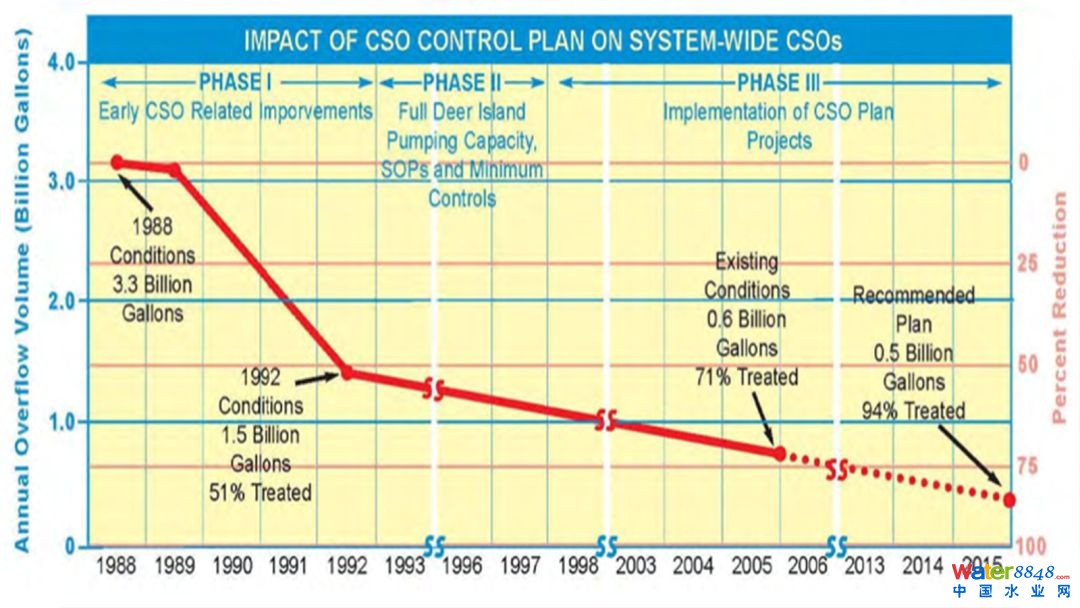 從1987年到2015年,所有合流制溢流污水整治工程的建設(shè)項(xiàng)目都已完成。合流制溢流污水每年減少量超過(guò)28億加侖(約106億升)。原有的84個(gè)溢流直排口中有34個(gè)已經(jīng)被關(guān)閉,5個(gè)直排口的設(shè)計(jì)標(biāo)準(zhǔn)提高至防范25年一遇的暴雨。93%的合流制溢流污水經(jīng)污水處理廠處理后才排放至自然水體。