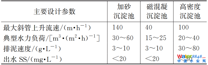 表1 加砂沉淀池、磁混凝沉淀池、高密度沉淀池用于CSO處理的主要設(shè)計參數(shù)