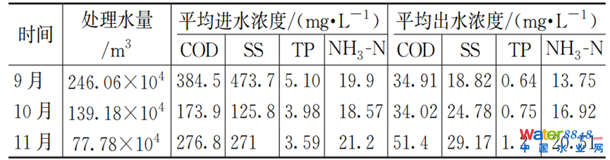 2014年9至 11月運(yùn)行期間,當(dāng)雨天污水處理廠進(jìn)水量超過設(shè)計水量的1.3倍時,將啟動CEPT系統(tǒng)進(jìn)行分流處理,CEPT單元的處理水量、進(jìn)出水污染物濃度見表4。由表4結(jié)果可知,CEPT對溢流污水COD、TP和SS的平均去除率分別為86.2%、80.3%和92.1%,對氨氮去除效果較差,僅為8.7%。對照現(xiàn)行《昆明市城鎮(zhèn)污水處理廠主要水污染物排放限值》(DB 5301/T 43-2020)中的E級限值,出水COD、TP濃度滿足COD<70mg/L和TP<2mg/L的要求。