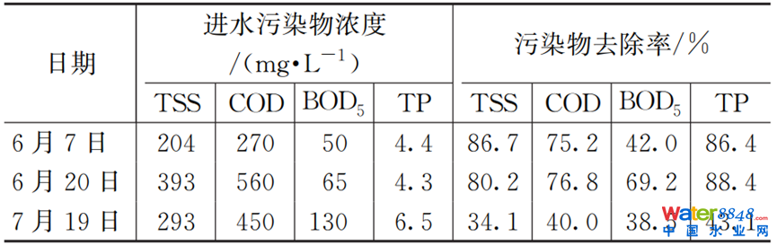雨天降雨數(shù)據(jù)及加砂沉淀單元運(yùn)行參數(shù)如表2所示。其中,6月7日的降雨量較小,加砂沉淀單元40%進(jìn)水來源于生物處理單元,其余60%為合流污水,而其他2次降雨事件的進(jìn)水則全部來源于CSO污水。由表3的處理效果可知,加砂沉淀對顆粒污染物的去除效果較好,6月份2場降雨TSS去除率分別為86.7%和80.2%,COD去除75.2%和76.8%,TP去除86.4%和88.4%,而第3場降雨處理效果較差的原因可能是混凝劑和微砂投加量較低所致。同時,加砂沉淀可實(shí)現(xiàn)溢流污水中9%~35%的TKN去除,但對氨氮的去除作用不大,而絮凝劑的使用使出水溶解性TP和正磷酸鹽維持在0.3 mg/L和0.1 mg/L的濃度水平。