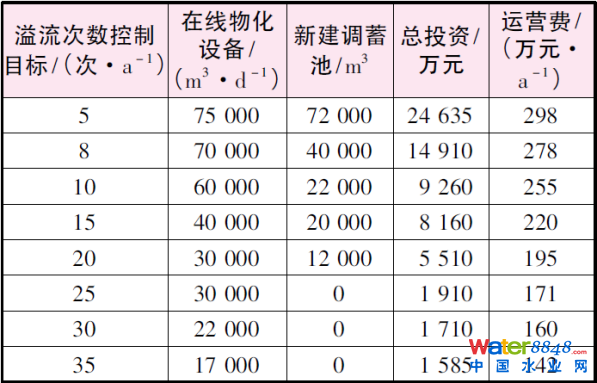 通過模型多方案比選,針對不同溢流控制目標,制定相對應(yīng)最合理工程措施設(shè)置方案。在此過程中,不斷調(diào)整各溢流頻次目標下的在線物化設(shè)備、CSO調(diào)蓄池等規(guī)模。對不同溢流次數(shù)控制目標進行對比,選取5、8、10、15、20、25、30和35次/年進行工程措施的制定。在一體化泵站提升富余能力8000m3/d和箱涵出口設(shè)置節(jié)制閘后箱涵的10680m3調(diào)蓄容積同等基礎(chǔ)下,各目標下合理的在線物化設(shè)備規(guī)模、CSO調(diào)蓄池容積、總投資和運營費用數(shù)據(jù)表如下。 表1 多目標控制下的工程措施和投資數(shù)據(jù)