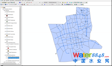 4.2.3 多目標工程措施比選利用MIKE URBAN CS搭建鄭坂箱涵上游區(qū)域模型,依據(jù)排水系統(tǒng)相對獨立的匯水區(qū)域,對水文模型的集水區(qū)進行劃分,并采用泰森多邊形法進行連接,設(shè)置集水區(qū)水文模型參數(shù),設(shè)置降雨水位邊界條件后,即建立該區(qū)域管網(wǎng)的水文、水動力模型。