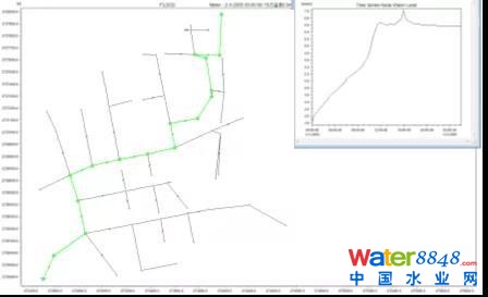 追蹤?quán)嵺嘞涑隹谥鞲汕,對區(qū)域內(nèi)的水位情況進行模擬。選取典型年2005年8月13日強降雨數(shù)據(jù)(215.1mm)輸入模型,得到上游區(qū)域箱涵管道水位線。結(jié)果顯示,鄭坂箱涵上游管道中水位運行,紅色為最大水位線,未超過地面檢查井標高,區(qū)域內(nèi)沒有出現(xiàn)內(nèi)澇積水,說明出口設(shè)置節(jié)制閘和CSO調(diào)蓄設(shè)施之后,上游區(qū)域無內(nèi)澇積水,不會對鄭坂箱涵行洪產(chǎn)生影響。