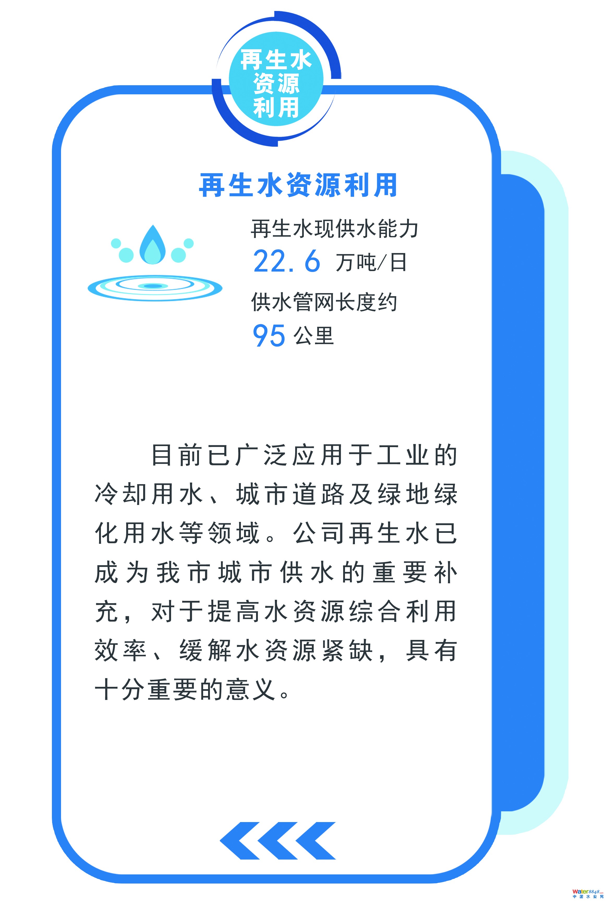 再生水現(xiàn)供水能力22.6萬噸/日,供水管網(wǎng)長度約95公里,目前已廣泛應用于工業(yè)的冷卻用水、城市道路及綠地綠化用水等領域。公司再生水已成為我市城市供水的重要補充,對于提高水資源綜合利用效率、緩解水資源緊缺,具有十分重要的意義。
