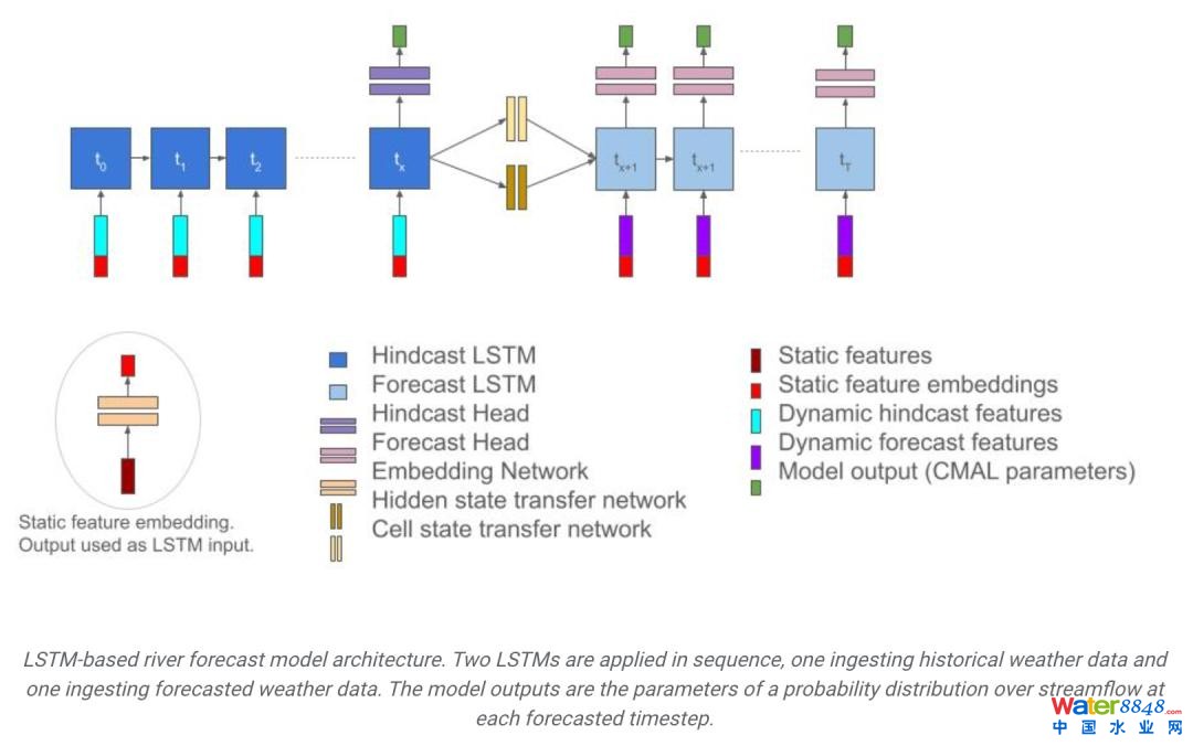 圖|基于 LSTM 的河流預報模型架構。兩個 LSTM 依次應用,一個接收歷史天氣數(shù)據(jù),另一個接收預測天氣數(shù)據(jù)。模型輸出為每個預報時間步的流量概率分布參數(shù)。
