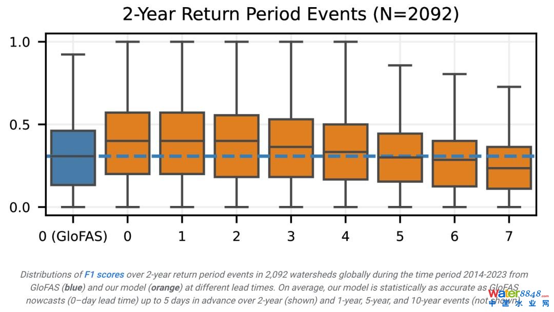 隨后,他們將該人工智能模型與全球領先的短期和長期洪水預測軟件——全球洪水預警系統(tǒng)(GloFAS)進行了對比測試。結果顯示,該模型同日預測準確率與當前系統(tǒng)相當甚至更高。