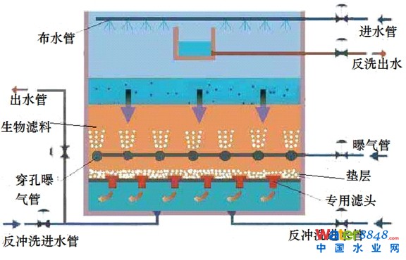 曝氣生物濾池是一種將生物氧化機(jī)理與深床過濾機(jī)理有機(jī)結(jié)合的新型污水生物處理技術(shù)。 (1)原理:以濾池中填裝的粒狀填料(如陶粒、焦炭、石英砂、活性炭等)為載體,在濾池內(nèi)部進(jìn)行曝氣,使濾料表面生長(zhǎng)著大量生物膜,當(dāng)污水流經(jīng)時(shí),利用濾料上所附生物膜中高濃度的活性微生物強(qiáng)氧化分解作用以及濾料粒徑較小的特點(diǎn),充分發(fā)揮微生物的生物代謝、生物絮凝、生物膜和填料的物理吸附和截留以及反應(yīng)器內(nèi)沿水流方向食物鏈的分級(jí)捕食作用,實(shí)現(xiàn)污染物的高效清除,同時(shí)利用反應(yīng)器內(nèi)好氧、缺氧區(qū)域的存在,實(shí)現(xiàn)脫氮除磷的功能。 (2)應(yīng)用范圍:曝氣生物濾池的應(yīng)用范圍較為廣泛,其在污水深度處理、中水回用、微污染源水處理、難降解有機(jī)物處理、低溫污水的硝化、低溫微污染水處理中都有很好的、甚至不可替代的功能。